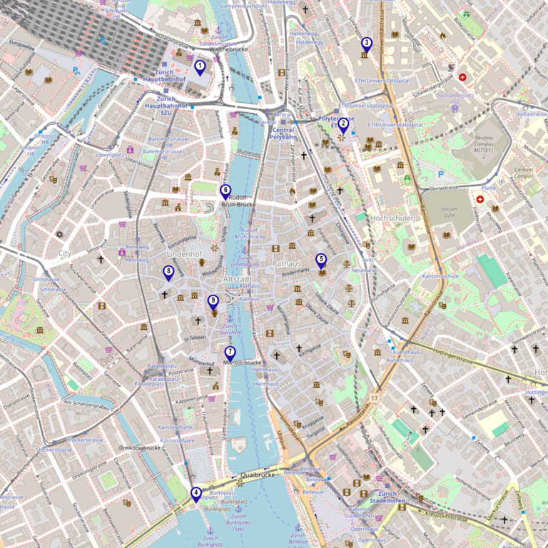 Hinweis Rollstuhlzugänglichkeit: Das Gelände beinhaltet mehrere steilere Auf- und Abstiege sowie Treppen in der Altstadt und zum ETH Campus. Es besteht jedoch die Möglichkeit diese mit kleineren Umwegen oder der Polybahn zu umgehen.